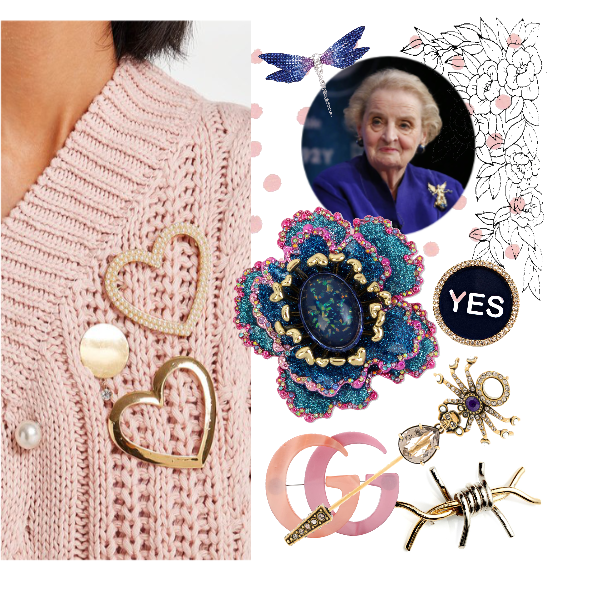 Fervent drager van broches was de vorig jaar overleden Madeleine Albright, voormalig Minister van Buitenlandse Zaken onder president Clinton. Ze had er naar gezegd honderden. Er is zelfs een hele tentoonstelling gewijd aan haar broche-collectie.