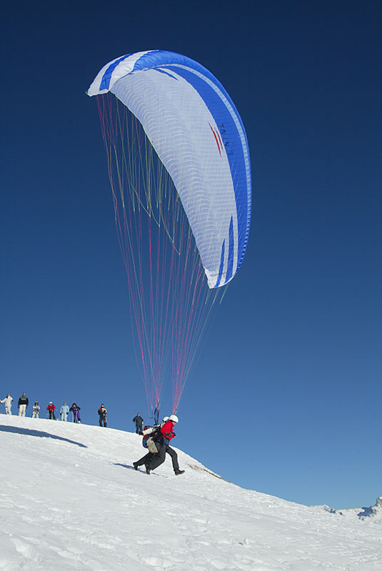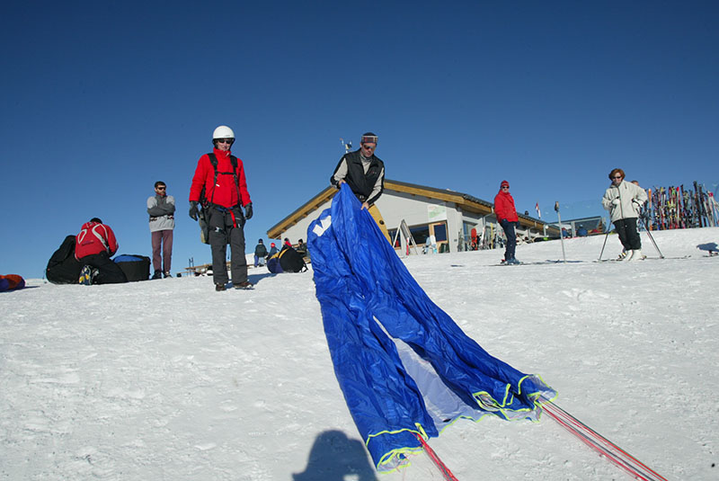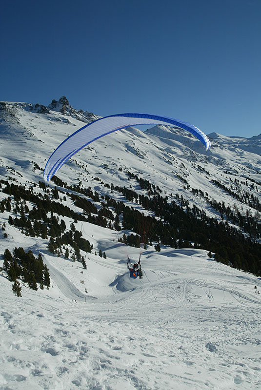 besneeuwde graspol tijdens de aanloop, en dat de piloot over me heen zou vallen